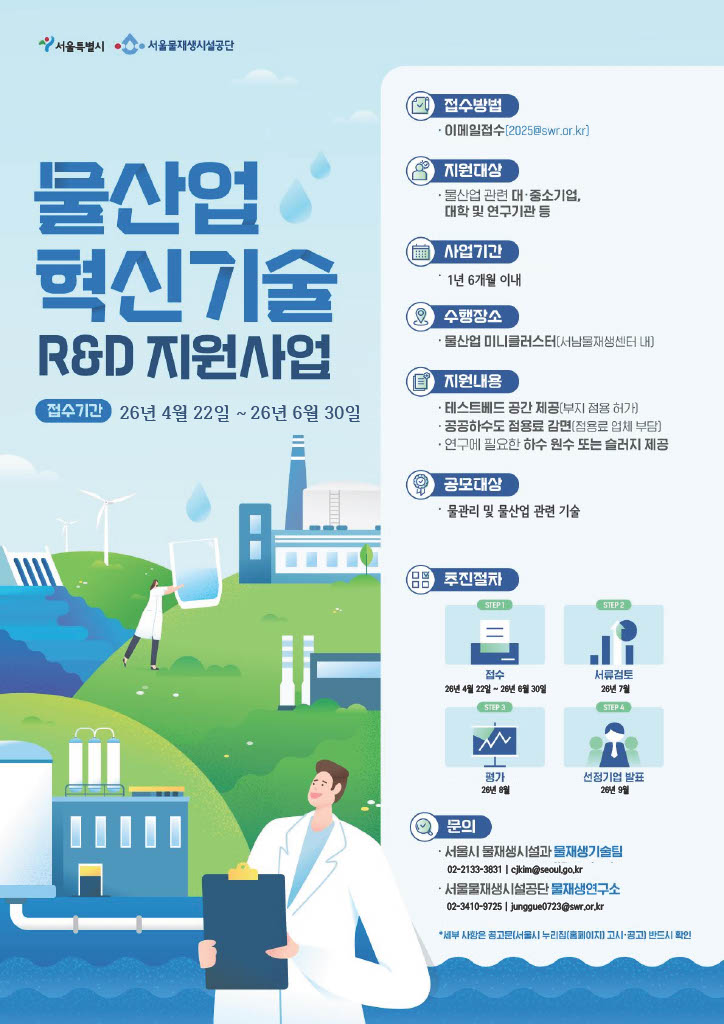 서울시에서는 우수한 기술력을 보유한 기업을 발굴·지원하여 기술경쟁력을 확보하고 물산업을 육성하고자 물산업 혁신기술 R&D 지원사업을 공모 중에 있습니다.