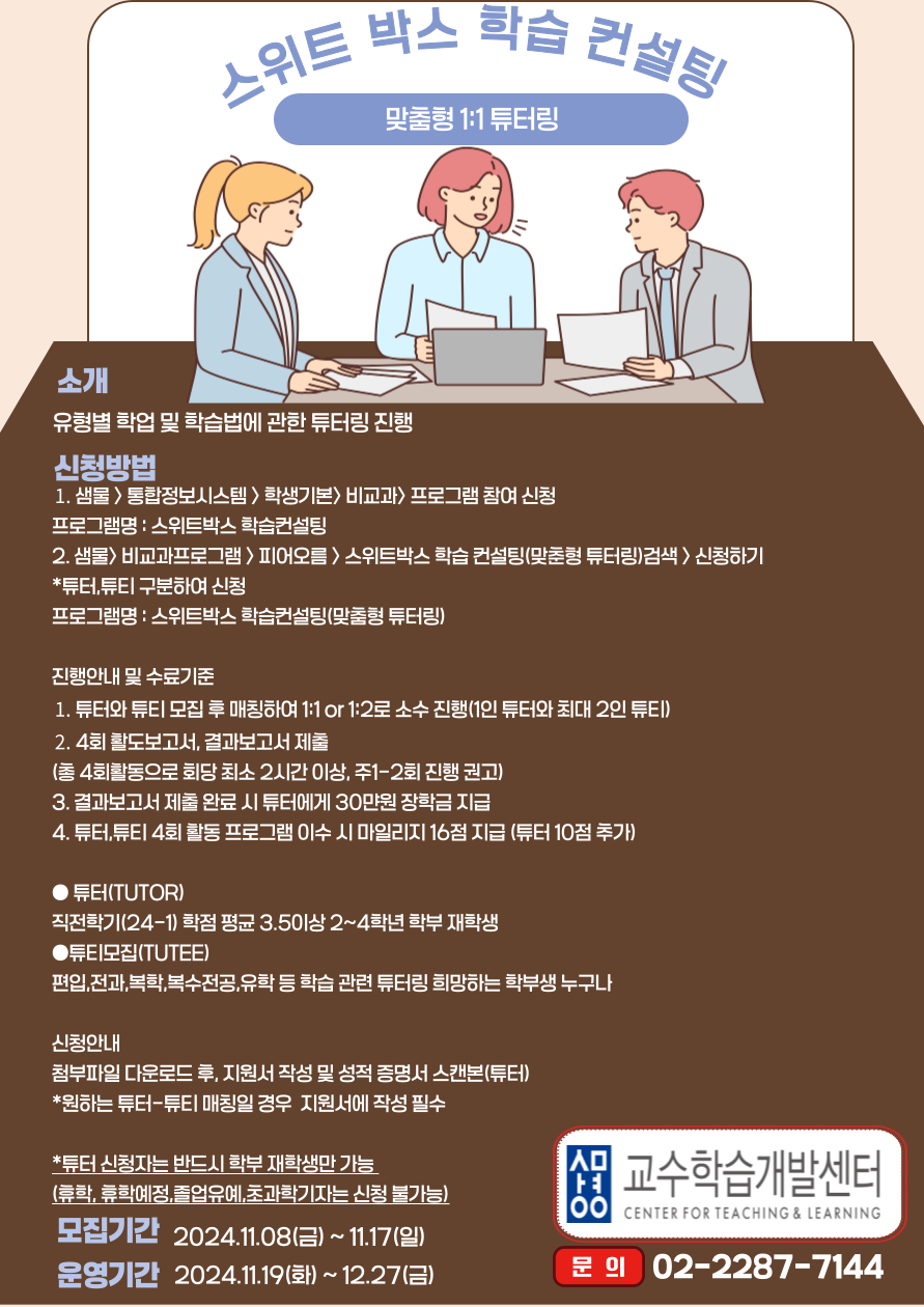 서울 [비교과] [교수학습혁신센터지원팀(서울)]2025학년도 2학기 스위트박스 학습컨설팅 모집 안내_트랙1 -